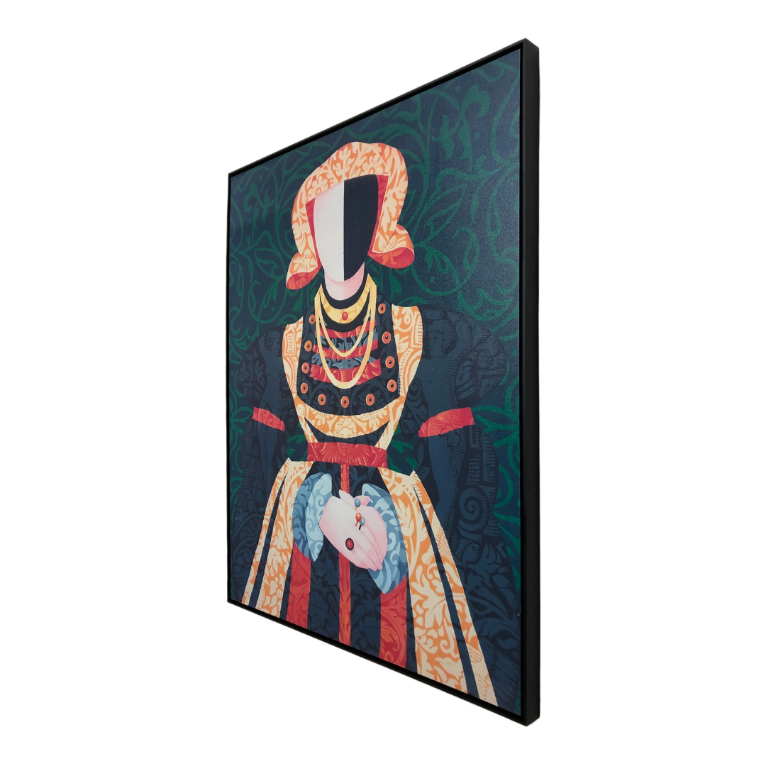 التصميم: يصور العمل شخصية مركزية ترتدي رداءً احتفالياً مليئاً بالنقوش المعقدة باللونين الأحمر والأبيض. تتزين الشخصية بقلائد متعددة الطبقات بتدرجات ذهبية، بينما يظهر الوجه بأسلوب تجريدي متباين الألوان. تستند الشخصية إلى خلفية خضراء زمردية داكنة مليئة بزخارف الكروم النباتية المتداخلة.