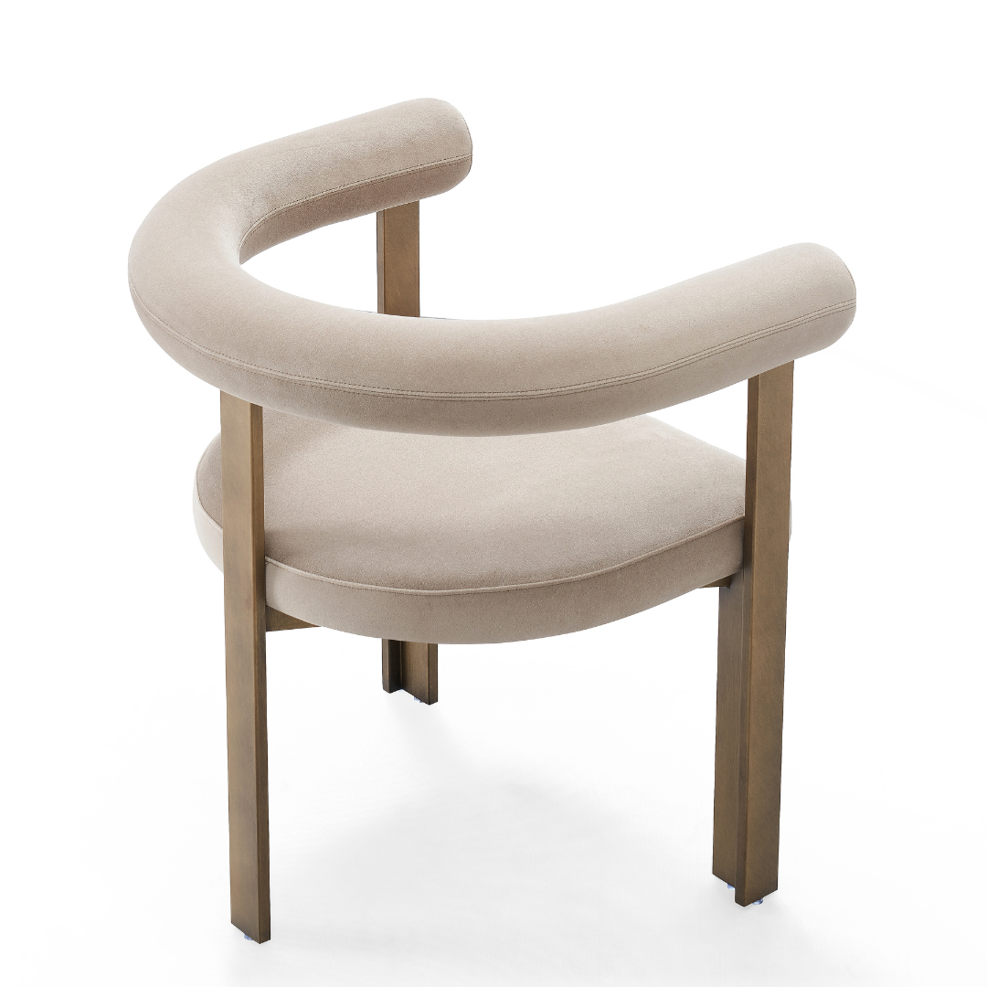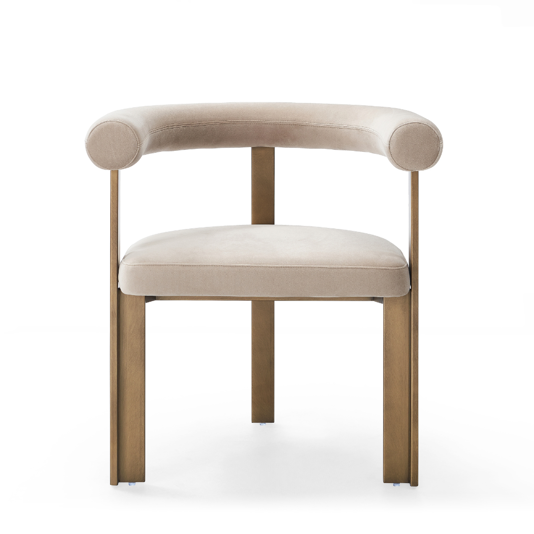 The Bram Greige Dining Chair - Brass Frame by Ris is the perfect blend of elegance, comfort, and modern luxury. The Bram Greige Dining Chair features a soft greige upholstered seat that exudes sophistication, complemented beautifully by its sleek brass frame. This stylish piece adds a warm and refined touch to any dining space, offering both visual appeal and lasting comfort for everyday use or special occasions.