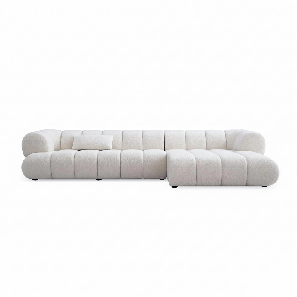 The Patras Sofa is a contemporary sectional that combines comfort with a sleek, modern design. Upholstered in a crisp white fabric, this sofa measures 336 x 167cm, providing ample space for relaxation and socializing. Features plush, segmented cushions that enhance the aesthetic appeal while offering a cozy seating experience.