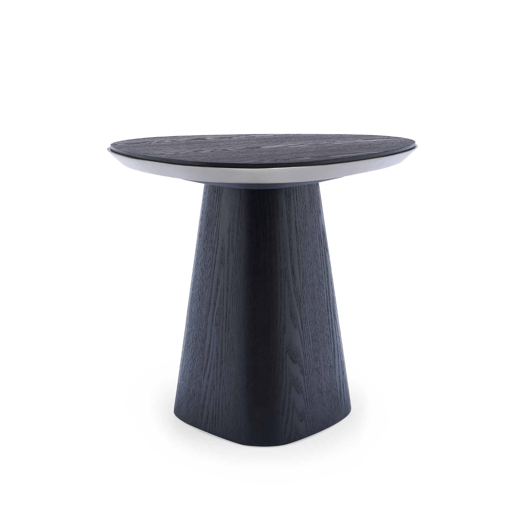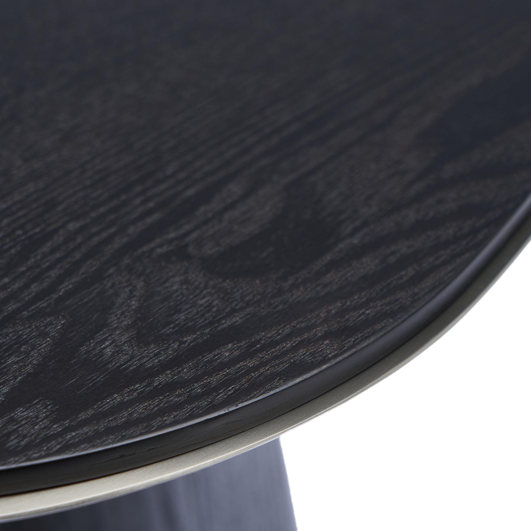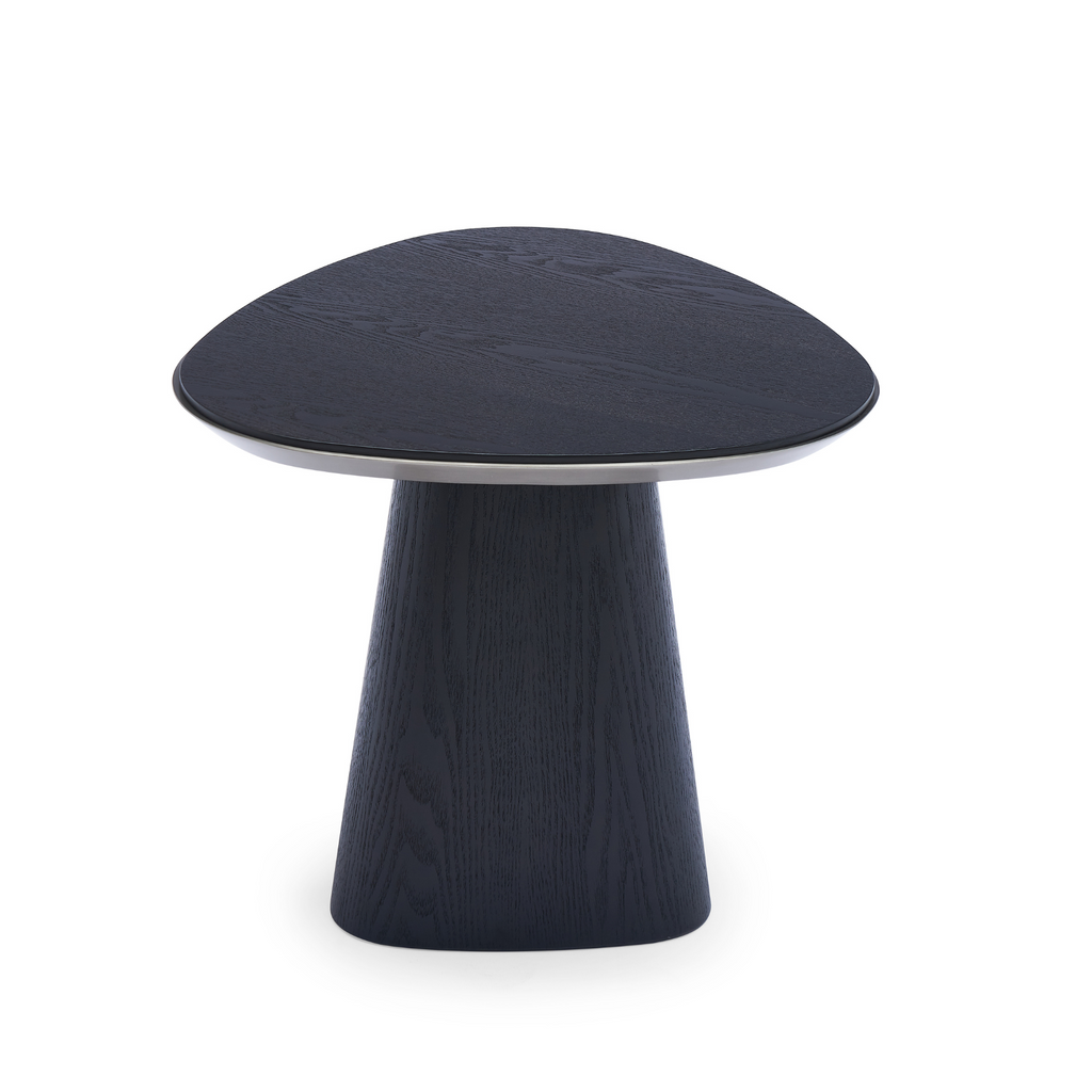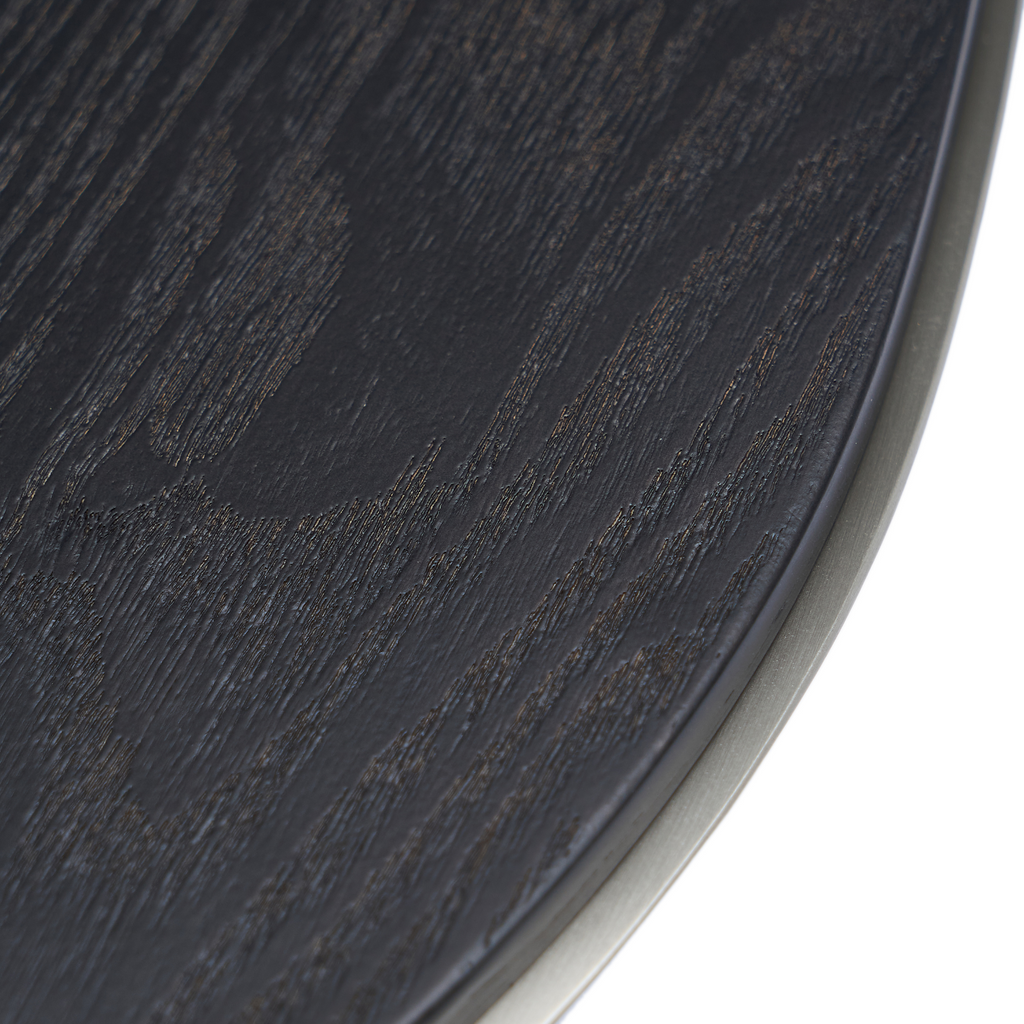 A modern side table with an MDF top and base wrapped in rich black oak veneer. Accented by a sleek stainless steel frame in a brushed nickel finish, this piece brings a sophisticated contrast of natural wood texture and industrial elegance.