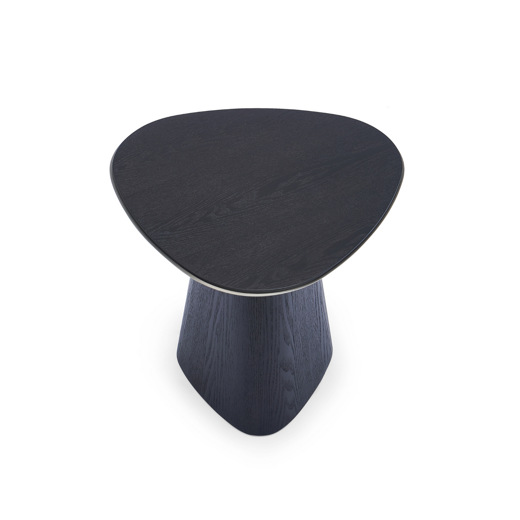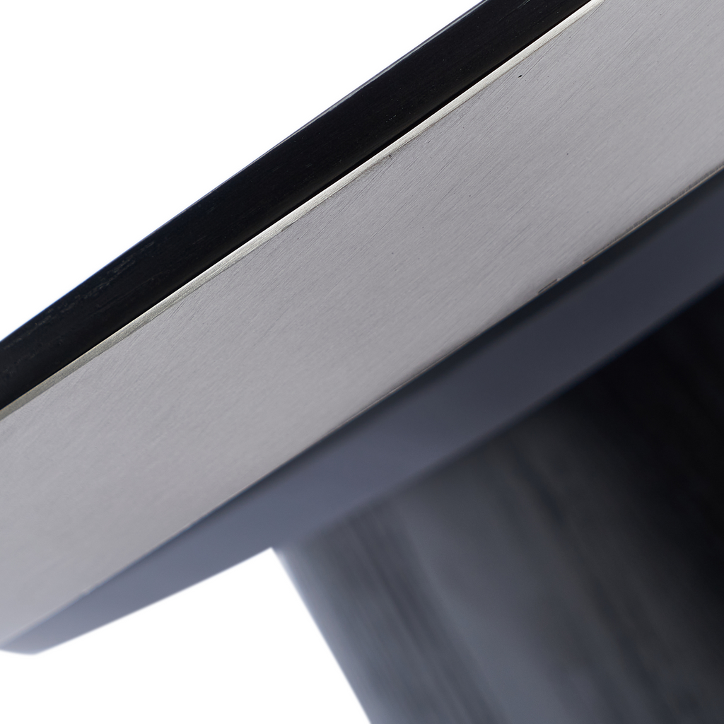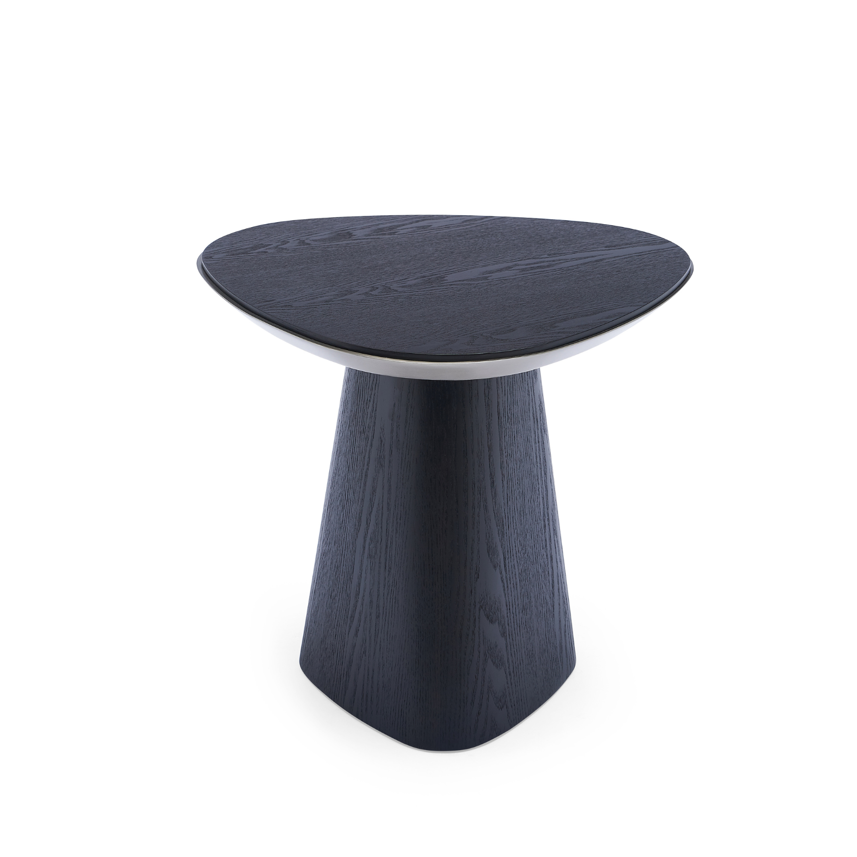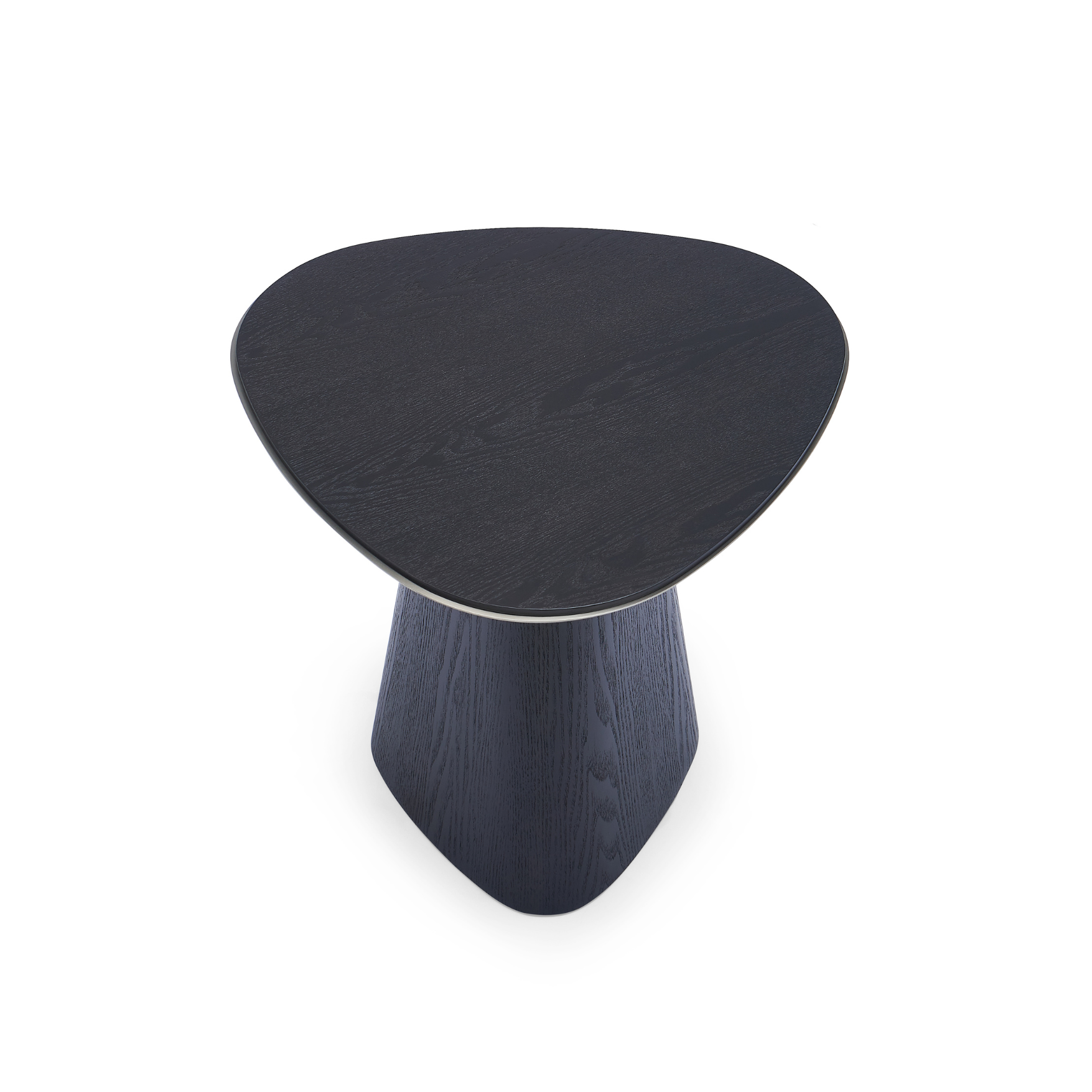 A modern side table with an MDF top and base wrapped in rich black oak veneer. Accented by a sleek stainless steel frame in a brushed nickel finish, this piece brings a sophisticated contrast of natural wood texture and industrial elegance.