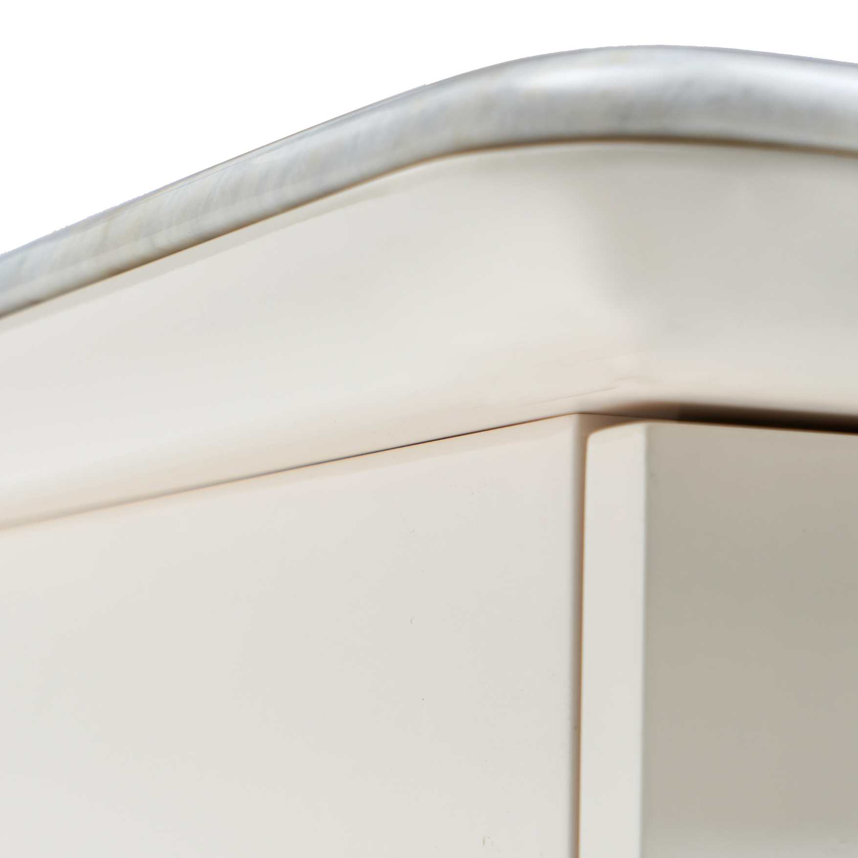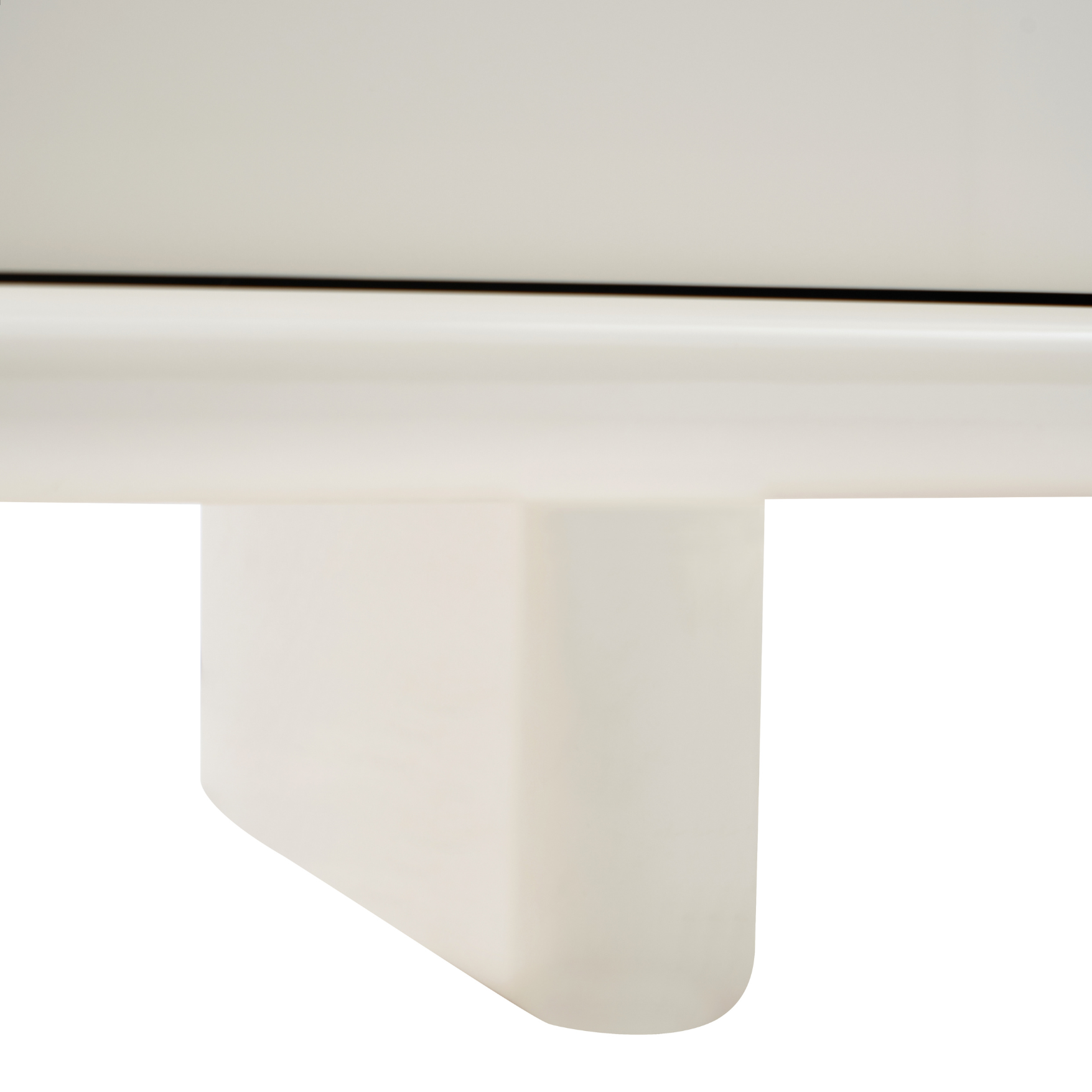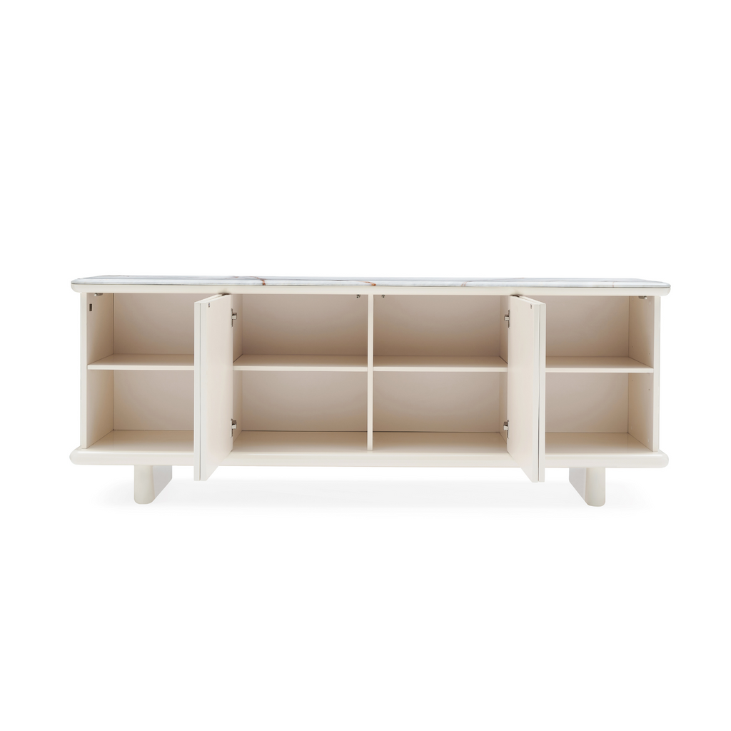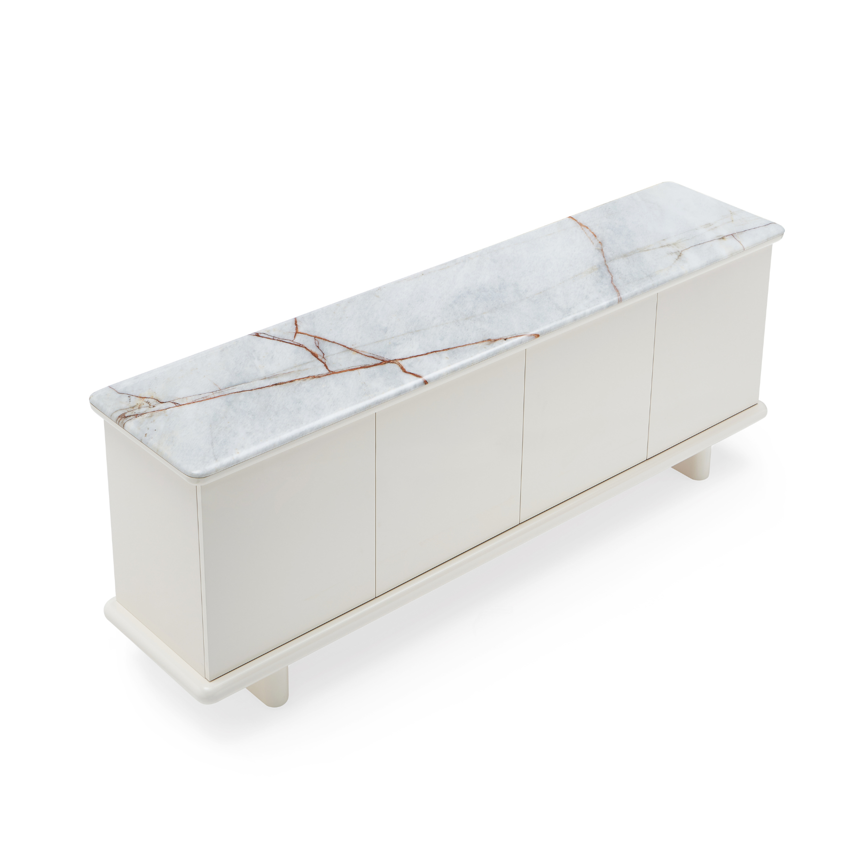 This sophisticated sideboard features a luxurious Versace marble top paired with a sleek cream-colored glossy lacquer finish on both the cabinet and legs. Clean lines and spacious shelving make it both elegant and practical, perfect for stylish, modern interiors.