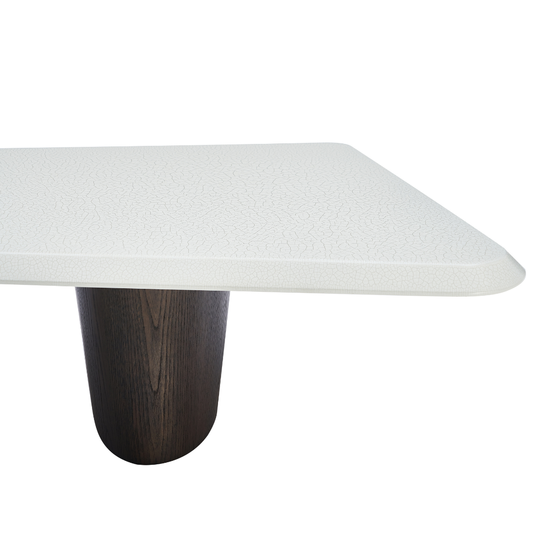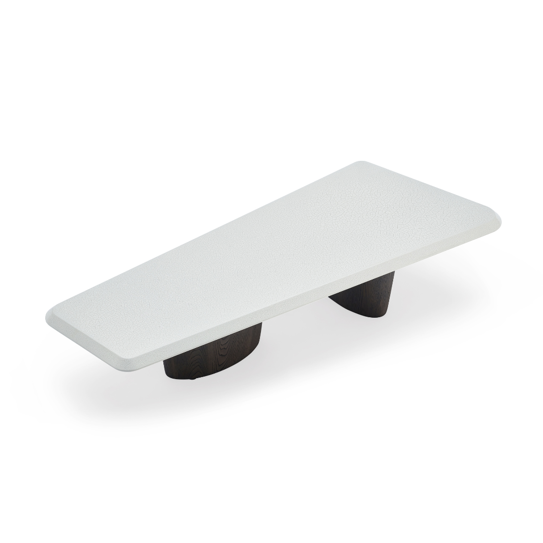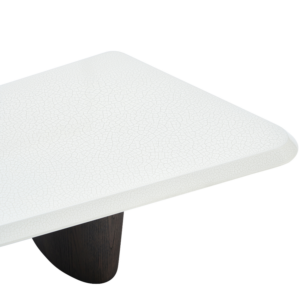 This modern coffee table features an MDF top in a creamy crackle paint finish, adding subtle texture and charm. The base is crafted from deep grey elm wood veneer with a smooth matte finish, creating a refined balance of warmth and contemporary style.