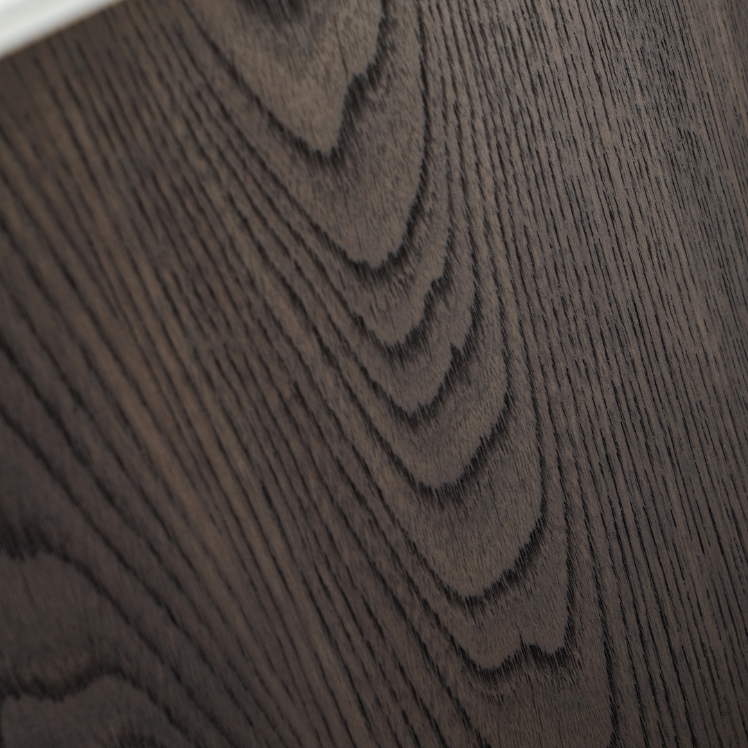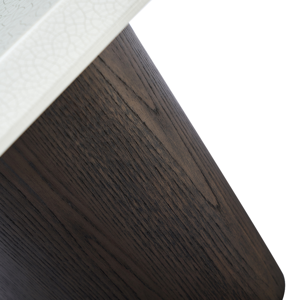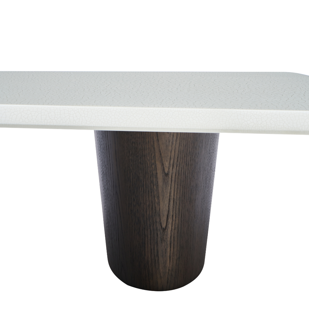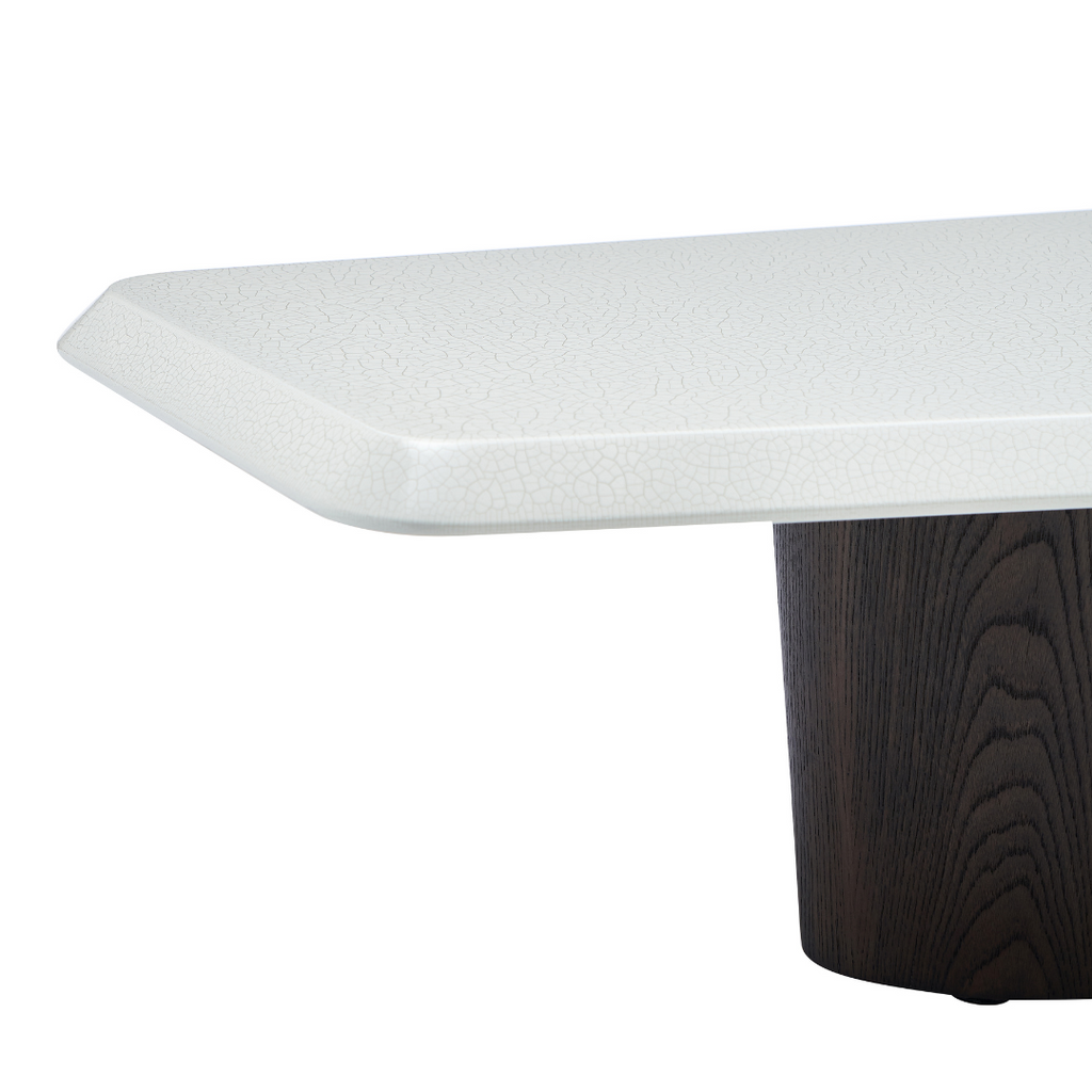 This modern coffee table features an MDF top in a creamy crackle paint finish, adding subtle texture and charm. The base is crafted from deep grey elm wood veneer with a smooth matte finish, creating a refined balance of warmth and contemporary style.