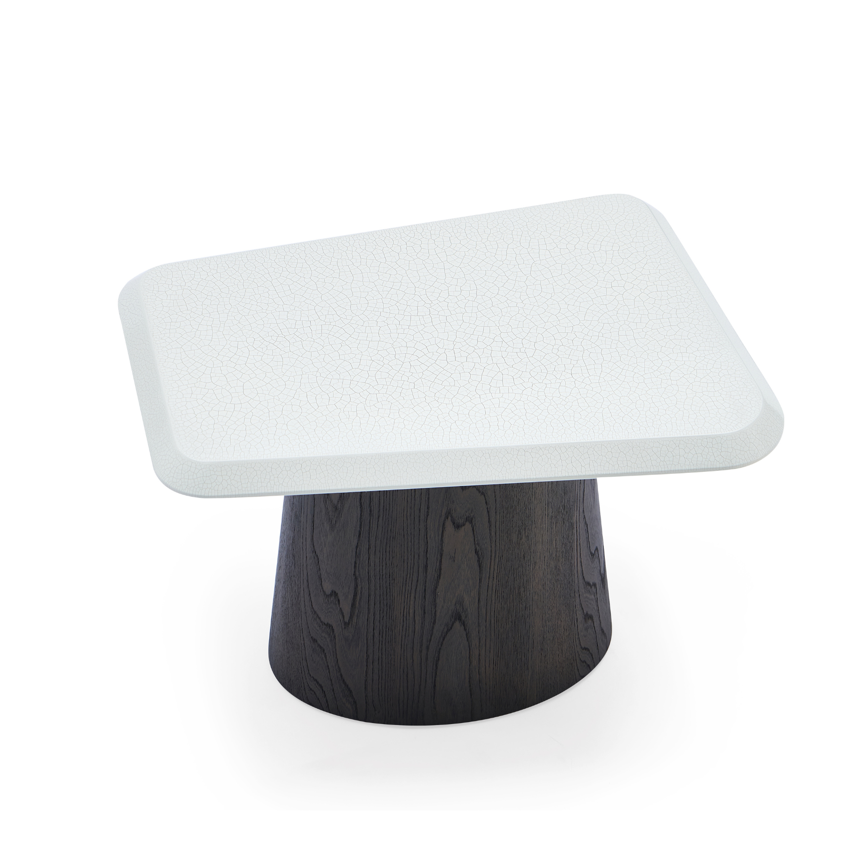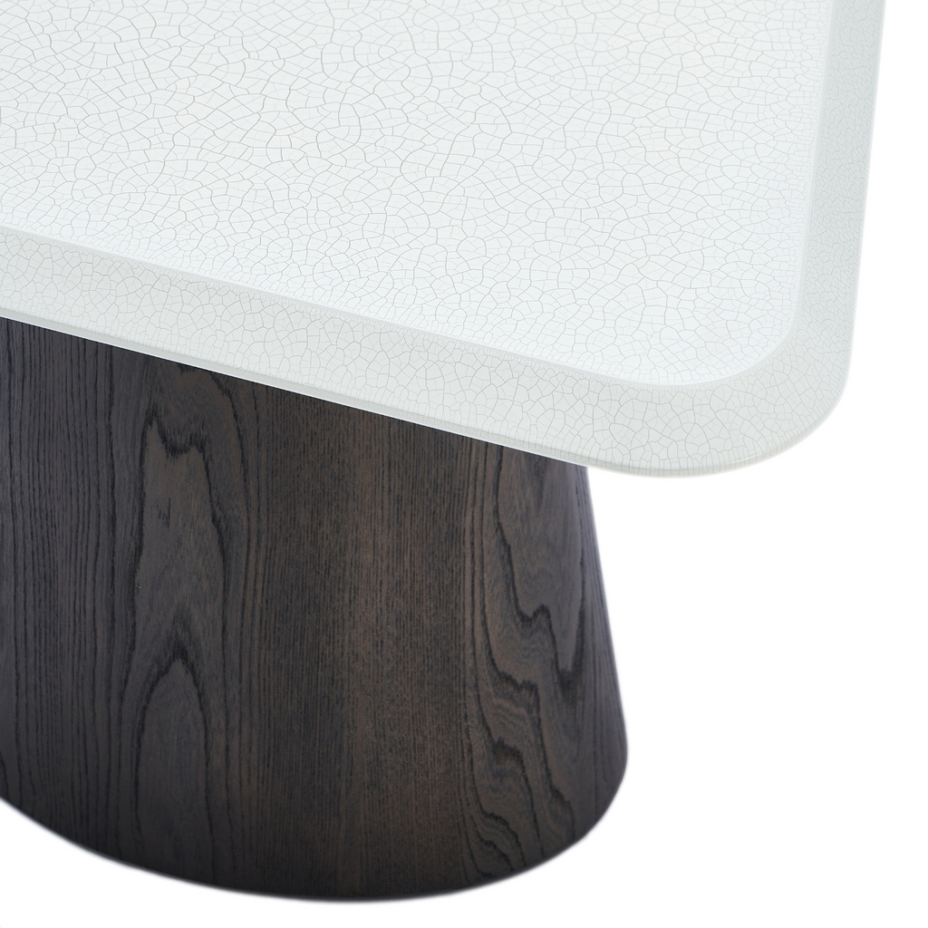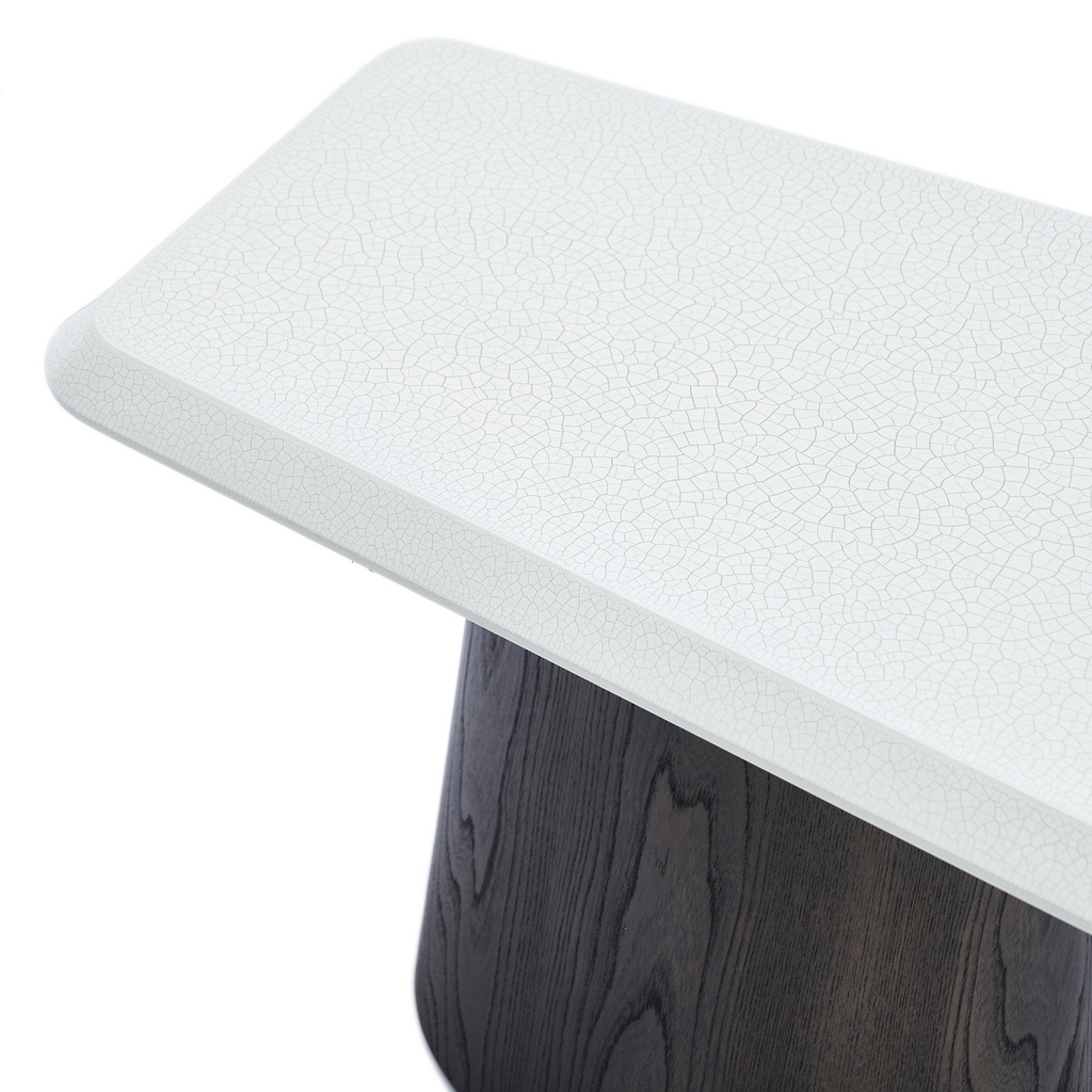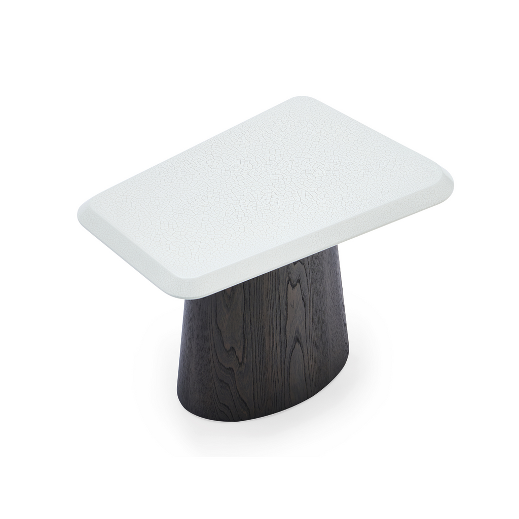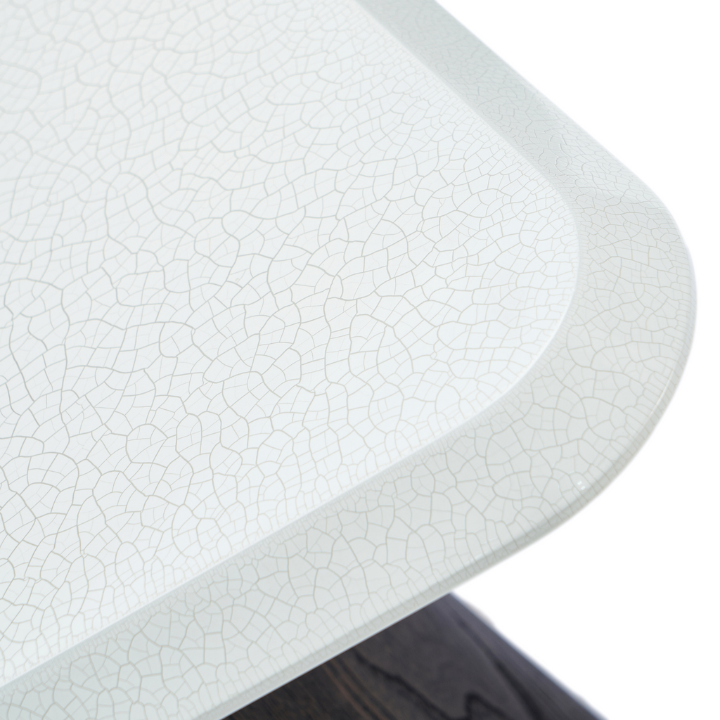 This stylish side table features an MDF top in a creamy crackle paint finish, offering a unique textured look. Paired with a deep grey elm wood veneer base in a smooth matte finish, it brings a touch of modern elegance to any space.