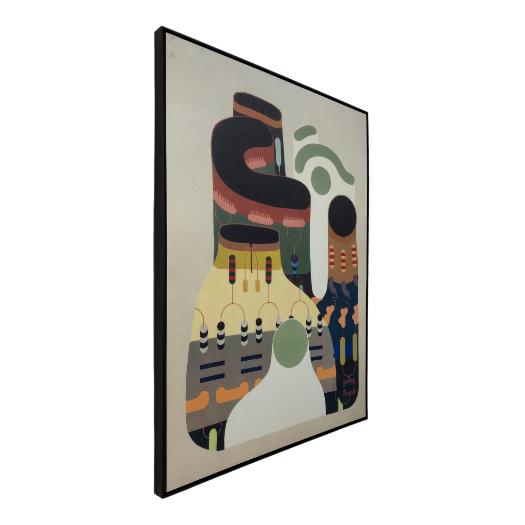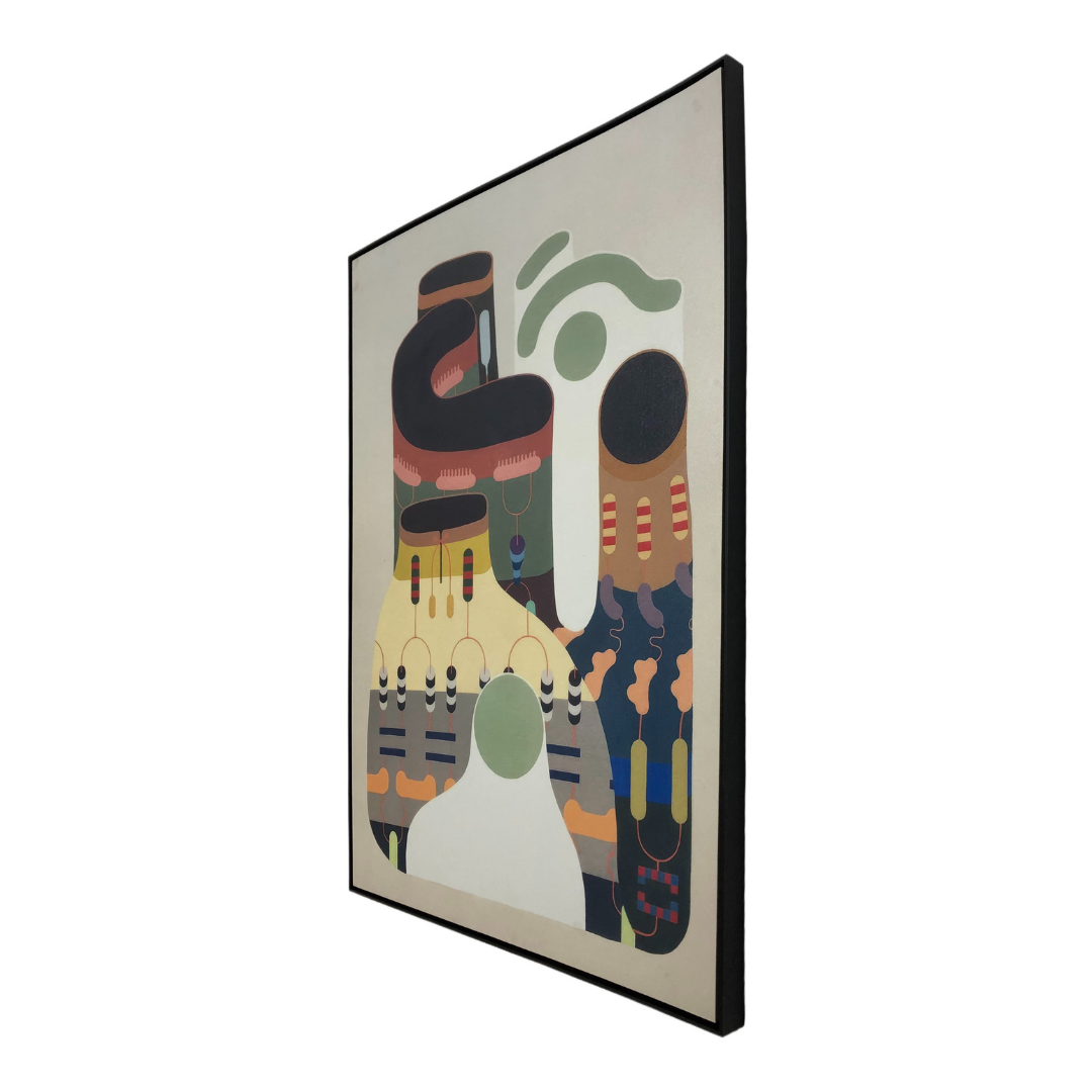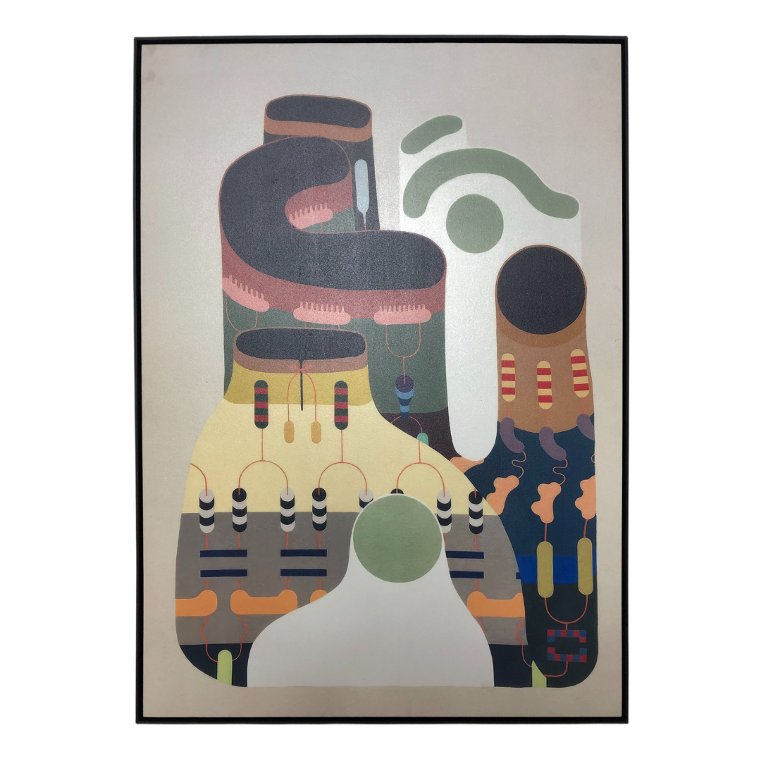 The Artiva Abstract framed canvas presents a contemporary composition defined by fluid, organic shapes and balanced asymmetry.