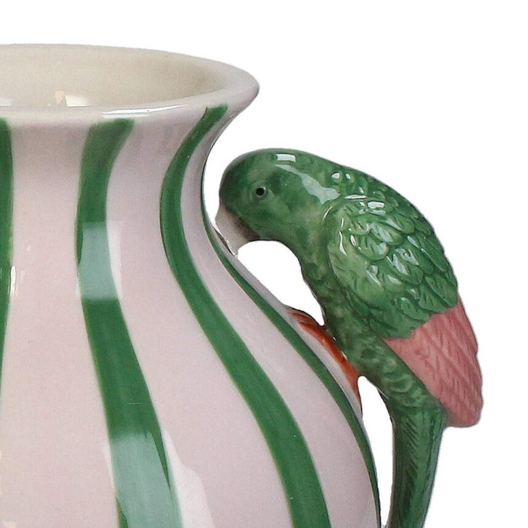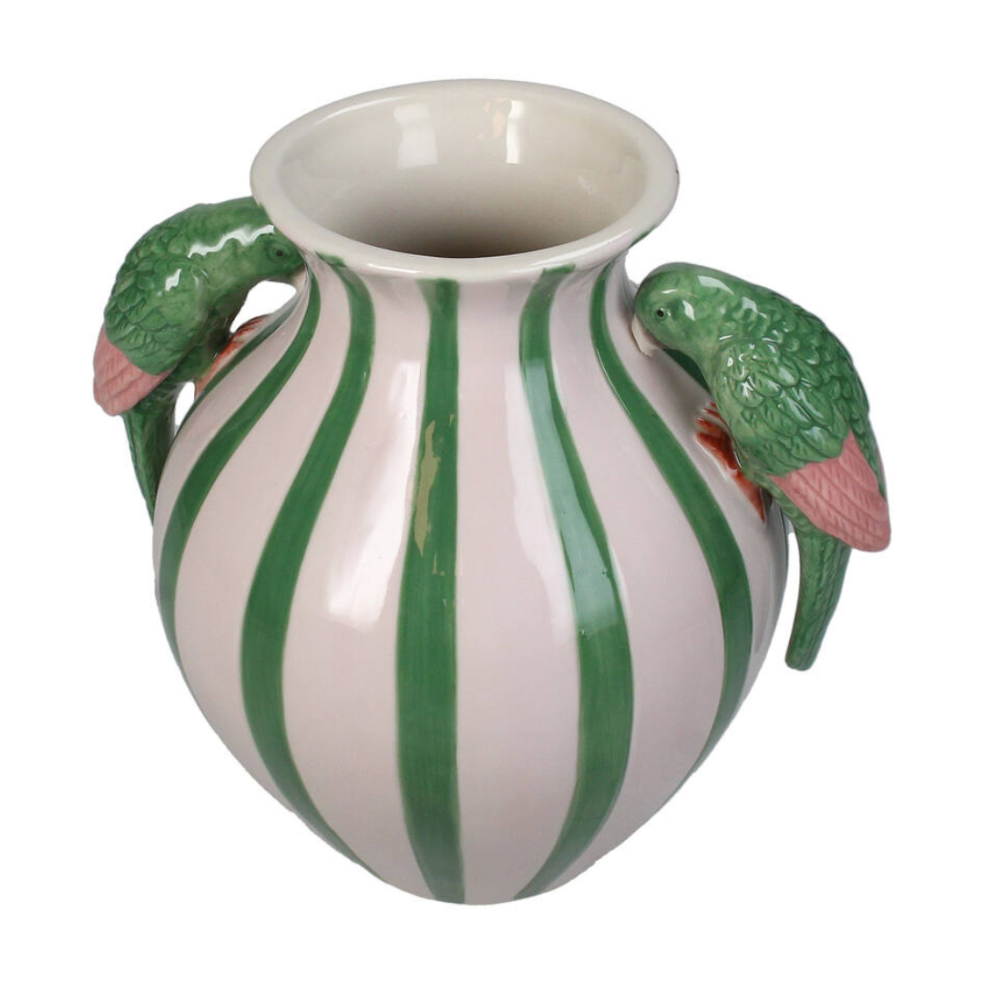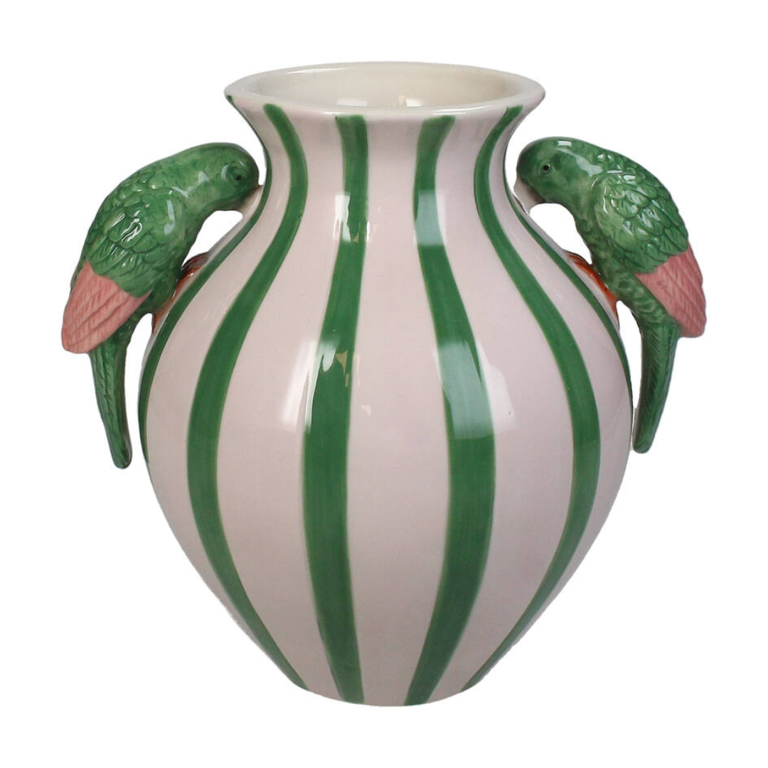 Bring a playful yet elegant touch to your home décor with the Parrot Stripe Vase from Ris. This unique vase features vibrant green stripes and intricately sculpted parrot handles that add character and charm to any space. The Parrot Stripe Vase is perfect for brightening up living rooms, shelves, or consoles, serving as both a decorative accent and a functional vase. Its eye-catching design makes it a standout piece that complements modern, eclectic, or tropical-inspired interiors.